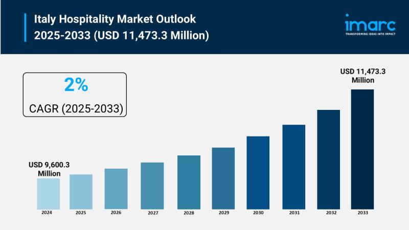 According to IMARC Group's latest research publication, "Italy Hospitality Market: Industry Trends, Share, Size, Growth, Opportunity and Forecast 2025-2033", the Italy hospitality market size was valued at USD 9,600.3 Million in 2024. Looking forward, IMARC Group estimates the market to reach USD 11,473.3 Million by 2033, exhibiting a CAGR of 2% during 2025-2033.