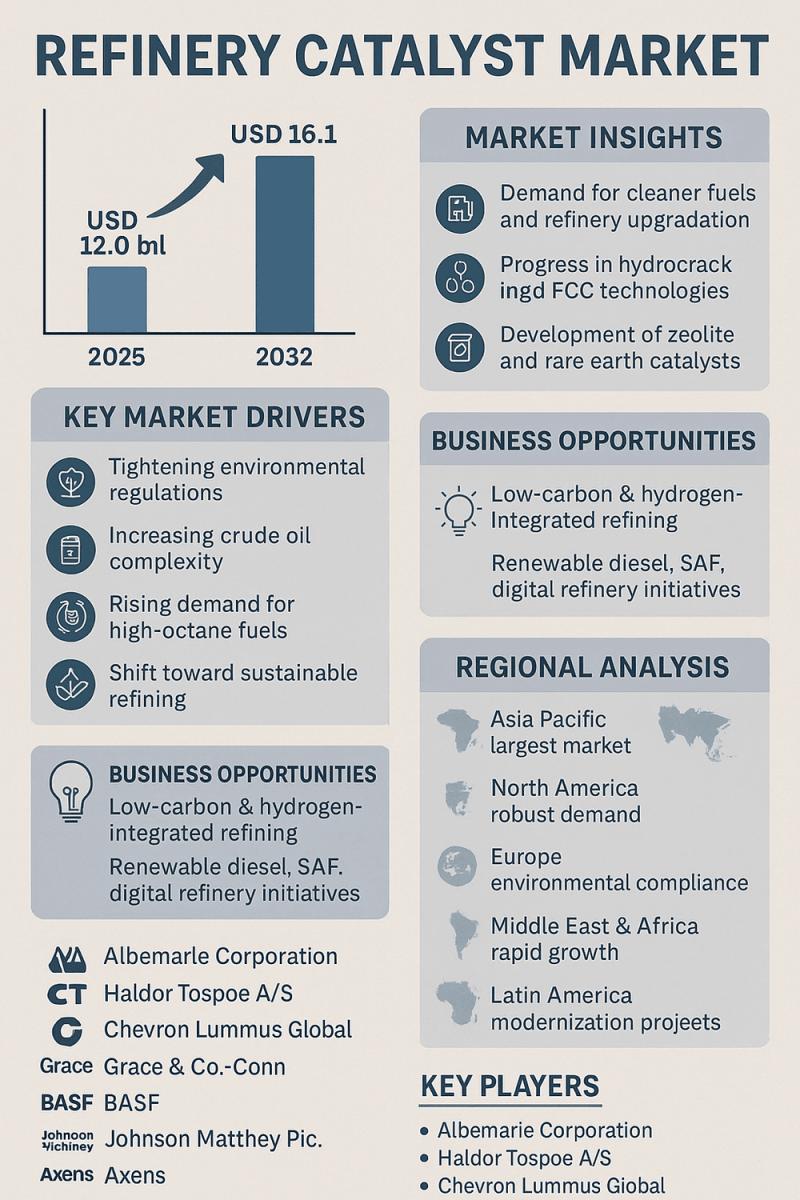 The global Refinery Catalyst Market is projected to expand from USD 12.0 billion in 2025 to USD 16.1 billion by 2032, registering a steady CAGR of 4.3% during the forecast period. The industry's growth reflects the rising global demand for cleaner fuels, refinery upgradation projects, and increasingly stringent environmental regulations pushing refiners toward more efficient catalyst solutions. Refinery catalysts play a crucial role in optimizing hydrocarbon conversion, enhancing fuel yield, and ensuring compliance with emission norms.Get a Sample PDF Brochure of the Report (Use Corporate Email ID for a Quick Response):