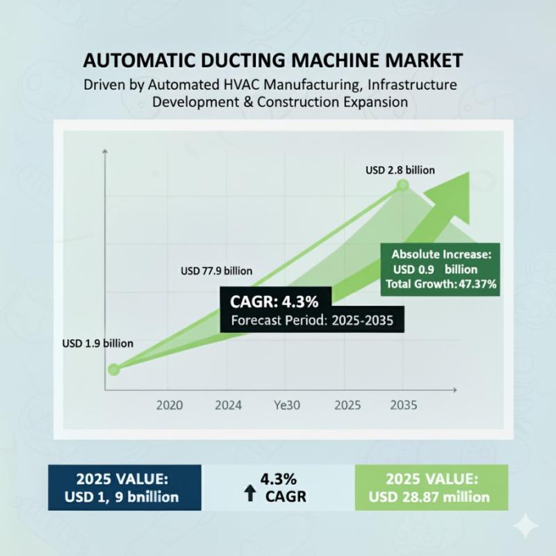 The global automatic ducting machine market is on track for consistent expansion through 2035, propelled by rising HVAC system demand, energy efficiency regulations, and the shift toward prefabricated construction. According to Future Market Insights (FMI), the market is valued at USD 1.9 billion in 2025 and is projected to hit USD 2.8 billion by 2035, growing at a compound annual growth rate (CAGR) of 4.3%.