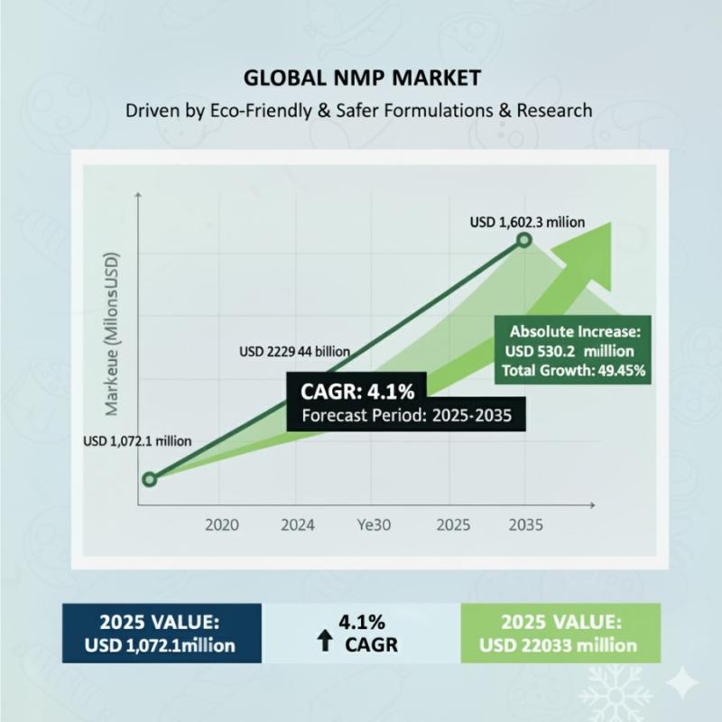 The global N-Methyl Pyrrolidone (NMP) market is poised for steady expansion through 2035, propelled by escalating needs in lithium-ion battery manufacturing, electronics, and petrochemical processing. According to Future Market Insights (FMI), the market stands at USD 1,072.1 million in 2025 and is forecasted to climb to USD 1,602.3 million by 2035, advancing at a compound annual growth rate (CAGR) of 4.1%.
