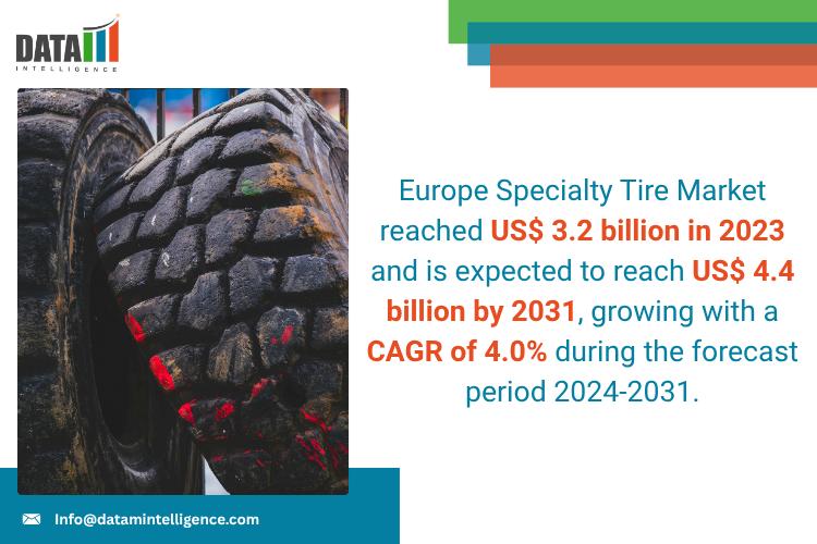 Europe Specialty Tire Market reached US$ 3.2 billion in 2023 and is expected to reach US$ 4.4 billion by 2031, growing with a CAGR of 4.0% during the forecast period 2024-2031.