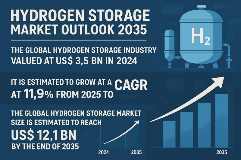 Hydrogen storage market, valued at US$ 3.5 billion in 2024, is projected to reach US$ 12.1 billion by 2035, expanding at a robust CAGR of 11.9% between 2025 and 2035. The strong growth trajectory is attributed to the surging global focus on clean energy technologies, large-scale decarbonization initiatives, and extensive investments in hydrogen infrastructure worldwide.Get a concise overview of key insights from our Report in this sample -