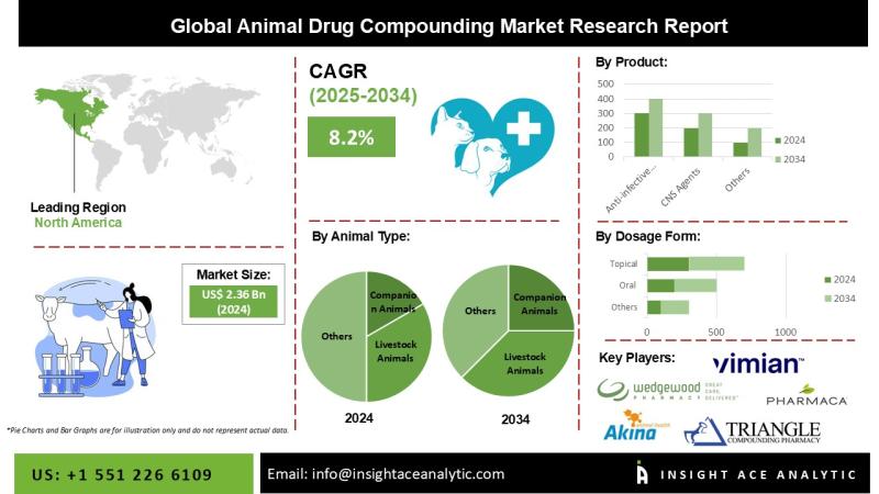 InsightAce Analytic Pvt. Ltd. announces the release of a market assessment report on the "Global Animal Drug Compounding Market Size, Share & Trends Analysis Report By Animal Type (Companion Animals, Livestock Animals), By Product (Anti-infective Agents, Anti-inflammatory Agents, Hormones & Substitutes, CNS Agents, GI Drugs), By Route of Administration (Oral, Injectable, Topical), By Dosage Form (Suspensions, Solutions, and Capsules)- Market Outlook And Industry Analysis 2034"