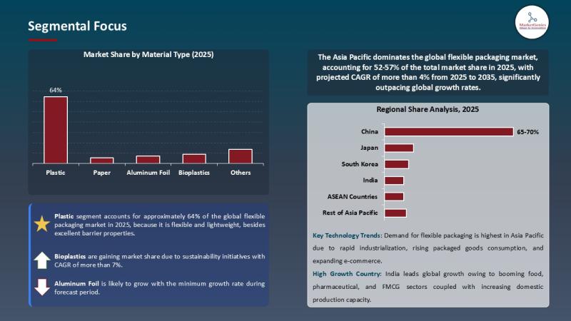Flexible packaging enables resealability, easy storage, lightweight handling, and product protection, making it ideal for ready-to-eat meals, snacks, beverages, and personal care products. Consumers' evolving preference for on-the-go consumption and portion-controlled packaging has strengthened market uptake significantly.