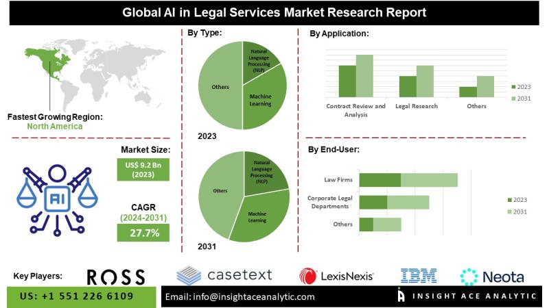 InsightAce Analytic Pvt. Ltd. announces the release of a market assessment report on the "Global AI in Legal Services Market - (By Type (Natural Language Processing (NLP), Machine Learning, Predictive Analytics, Data Analytics and Visualization, Robotic Process Automation (RPA), Virtual Assistants, Expert Systems), By Application (Contract Review and Analysis, Legal Research, E-Discovery and Litigation Support, Due Diligence, Predictive Legal Analytics, Compliance Management, Document Automation, Case Prediction and Outcome Analysis, Intellectual…