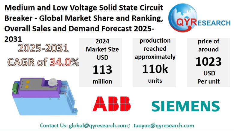 The global market for Medium and Low Voltage Solid State Circuit Breaker was estimated to be worth US$ 113 million in 2024 and is forecast to a readjusted size of US$ 854 million by 2031 with a CAGR of 34.0% during the forecast period 2025-2031.