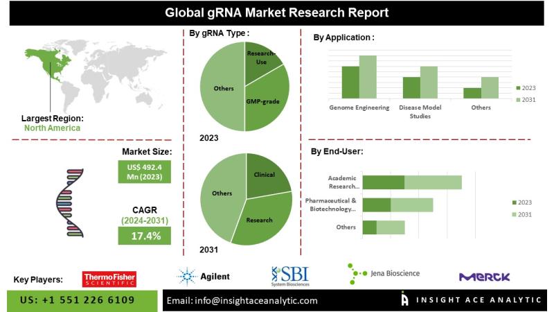 InsightAce Analytic Pvt. Ltd. announces the release of a market assessment report on the "Global gRNA Market Size, Share & Trends Analysis Report By Product & Services (Products, Custom gRNA Synthesis Services), gRNA Type (Research-Use, GMP-grade), Application (Genome Engineering, Disease Model Studies, Functional Genomics, Epigenetics, Others), End-use (Pharmaceutical & Biotechnology Companies, Academic Research Institutes, CMOs & CROs)- Market Outlook And Industry Analysis 2031"