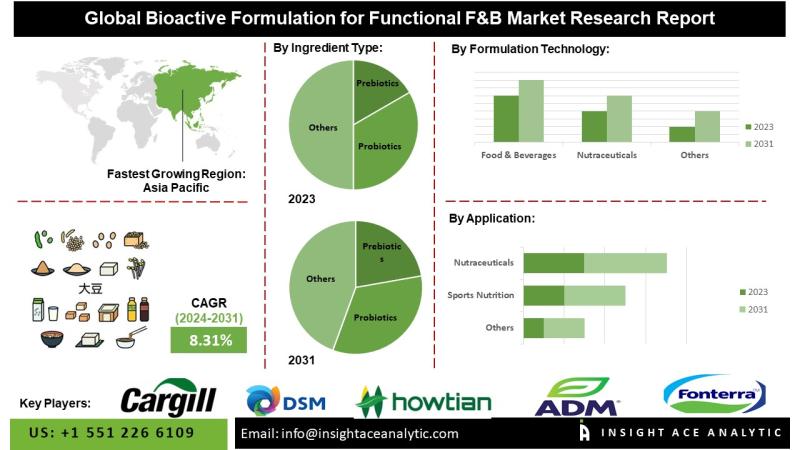 InsightAce Analytic Pvt. Ltd. announces the release of a market assessment report on the "Bioactive Formulation for Functional F&B Market"-, By Ingredient Type (Prebiotics, Probiotics, Adaptogens, Polyphenols, Omega-3 Fatty Acids, Antioxidants), By Formulation Technology (Encapsulation, Microemulsions, Liposomal Delivery), By Application (Food & Beverages (Dairy Products, Non-Dairy Beverages, Snack Foods, Dietary Supplements) Nutraceuticals, Sports Nutrition), Industry Trends, and Global Forecasts, 2022-2035 And Segment Revenue and Forecast To 2031."