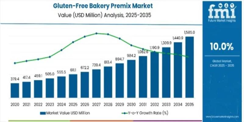 The global gluten-free bakery premix market, valued at USD 611.1 million in 2025, is projected to surge to USD 1,585.7 million by 2035, reflecting a CAGR of 10%. Rising cases of celiac disease, growing consumer preference for allergen-free foods, and demand for convenient baking solutions are key drivers of this growth.