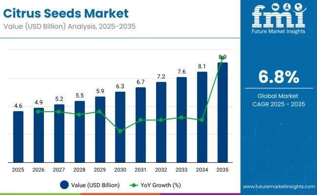 The global citrus seeds market is projected to grow from USD 4.6 billion in 2025 to USD 8.9 billion by 2035, reflecting a CAGR of 6.8%. This expansion represents an absolute opportunity of USD 4.3 billion, highlighting rising adoption across dietary supplements, cosmetics, and oil extraction industries.