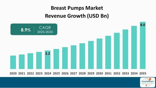 The global breast pumps market is witnessing robust expansion, driven by rising awareness of breastfeeding benefits, growing numbers of working mothers, and rapid advancements in medical device technology. Valued at US$ 3.2 billion in 2024, the industry is projected to grow at a compound annual growth rate (CAGR) of 8.9% from 2025 to 2035, reaching more than US$ 8.0 billion by 2035.