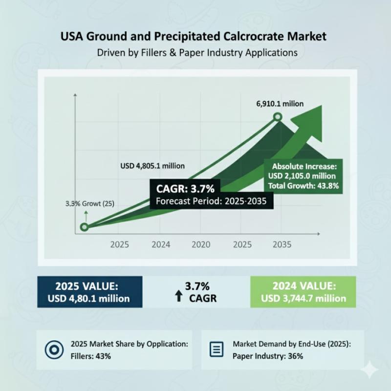 The USA ground and precipitated calcium carbonate (GCC and PCC) market is poised for consistent growth through 2035, propelled by infrastructure resurgence, eco-friendly fillers in plastics and paper, and rising demand for high-performance coatings. According to Future Market Insights (FMI), the market is valued at USD 4,805.1 million in 2025 and is projected to hit USD 6,910.1 million by 2035, advancing at a compound annual growth rate (CAGR) of 3.7%.The FMI report, "USA Ground and Precipitated Calcium Carbonate Market Size, Share, and Forecast 2025-2035," reveals an incremental USD 2.1 billion in revenues over the decade, driven by GCC's dominance in cost-effective applications and PCC's surge in specialty, sustainable formulations.
