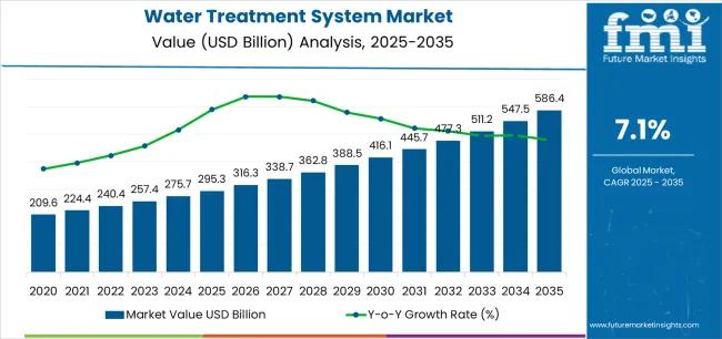 According to the latest analysis by Future Market Insights, the global water treatment system market is entering a transformative growth phase, driven by intensifying water scarcity, rapid urbanization, and the urgent need for sustainable water management. Valued at USD 295.3 billion in 2025, the market is projected to reach USD 586.4 billion by 2035, expanding at a CAGR of 7.1% and nearly doubling in size over the forecast period.
