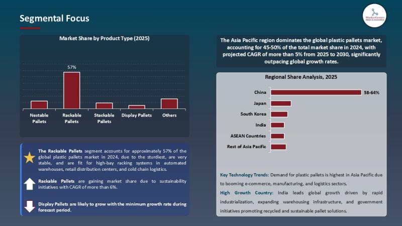 Asia Pacific's expanding FMCG, automotive, and pharmaceutical sectors make it the most attractive region for long-term investment, accounting for the largest share of global demand in 2025 and beyond. The region's increasing focus on hygiene, efficiency, and sustainability further solidifies its position in the global pallets market.