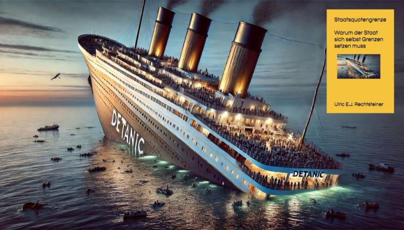 Germany symbolized as the sinking "DETANIC" on the book cover. ( (C) Ulric E.J. Rechtsteiner @ Dall-E)