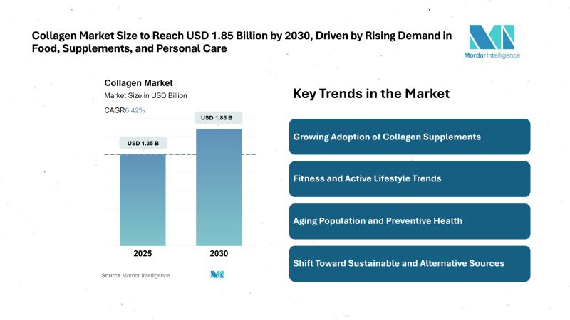 Introduction: Expanding Role of Collagen in Global Health and WellnessAccording to the Mordor Intelligence Global Collagen Market Industry Report. the global collagen market size is estimated at USD 1.35 billion in 2025 and is projected to reach USD 1.85 billion by 2030, growing at a CAGR of 6.42% during the forecast period (2025-2030).