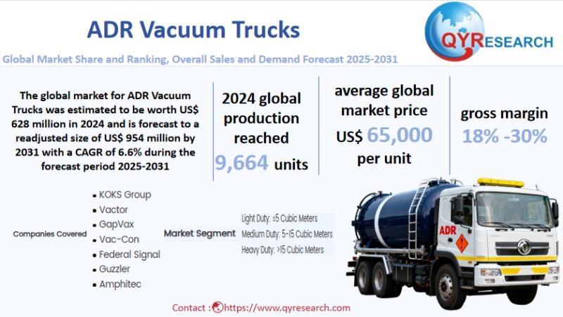 Unlock the Future of the ADR Vacuum Trucks Market: Comprehensive Global Market Report 2025-2031Global leading market research publisher QYResearch published the release of its latest report, "ADR Vacuum Trucks - Global Market Share, Ranking, Sales, and Demand Forecast 2025-2031". This in-depth report provides a complete analysis of the global ADR Vacuum Trucks market, offering critical insights into market size, share, demand, industry development status, and future forecasts. Whether you're a stakeholder, investor, or industry player, this report equips you with the data and strategies needed to stay ahead in a rapidly evolving market.