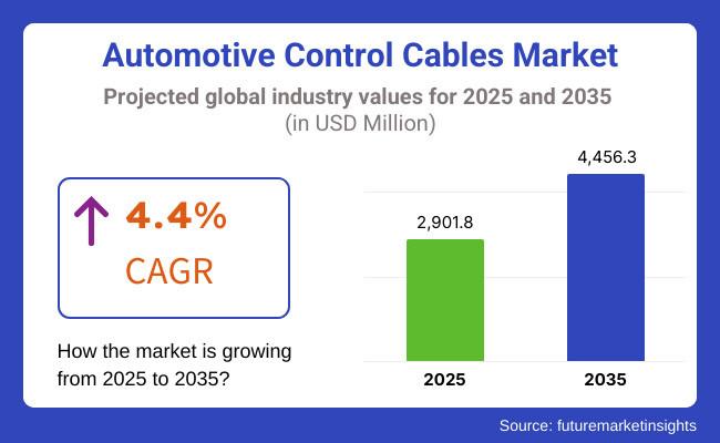 The global automotive control cables market is projected to grow from USD 2,901.8 million in 2025 to USD 4,456.3 million by 2035, expanding at a CAGR of 4.4%, according to Future Market Insights. The market's growth is underpinned by the accelerating production of electric and hybrid vehicles, advancements in smart control systems, and increasing demand for lightweight, high-performance cables in modern automotive architectures.