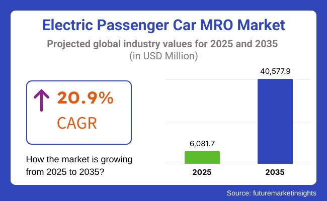 The global electric passenger car maintenance, repair, and overhaul (MRO) market is on track for exponential growth, expanding from USD 6.08 billion in 2025 to USD 40.58 billion by 2035, registering a CAGR of 20.9%, according to Future Market Insights. This surge underscores the rapid expansion of the global electric vehicle (EV) fleet and the rising need for specialized services in electric drivetrains, batteries, and smart vehicle electronics.While electric vehicles typically require less frequent maintenance than traditional internal combustion engine (ICE) cars, their advanced components-particularly high-voltage batteries, electric motors, and software-driven systems-demand expert, certified service networks. The transition from ICE to EV technology is reshaping global aftersales ecosystems, creating new markets for battery diagnostics, thermal management system repair, motor servicing, and ADAS software updates.