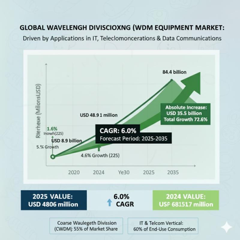 The global wavelength division multiplexing (WDM) equipment market is poised for robust expansion through 2035, propelled by surging data traffic, 5G rollouts, cloud computing, and AI-driven applications. According to Future Market Insights (FMI), the market is valued at USD 48.9 billion in 2025 and is projected to hit USD 84.4 billion by 2035, growing at a compound annual growth rate (CAGR) of 6.0%.
