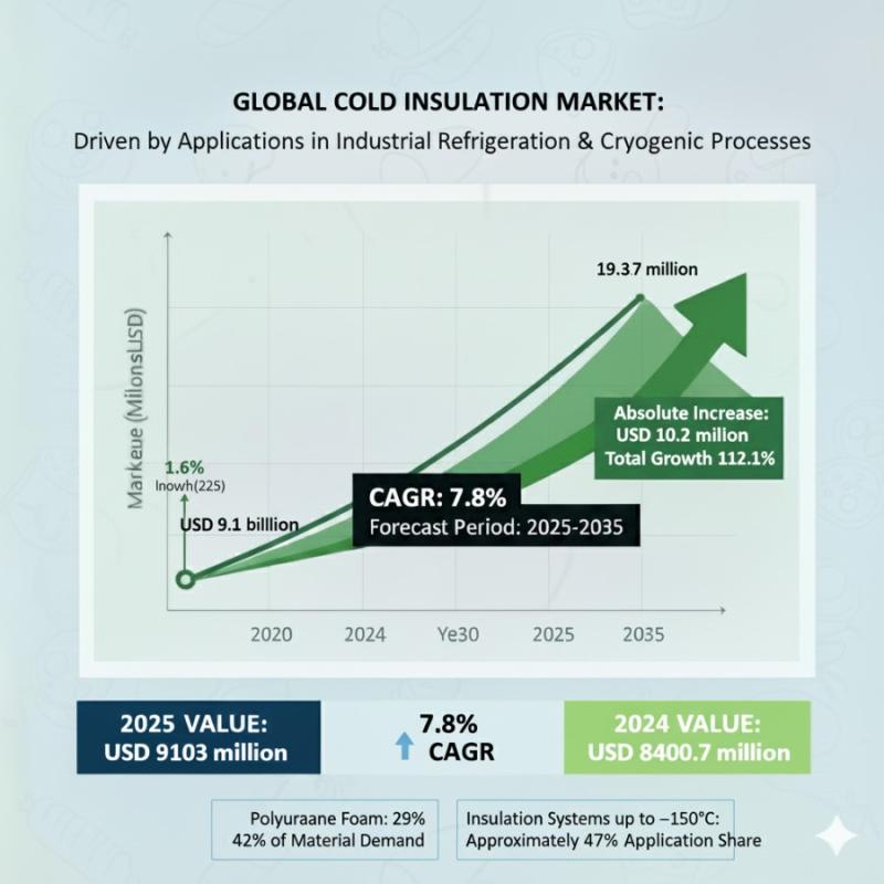 The global cold insulation market is set for robust expansion through 2035, fueled by surging LNG infrastructure, pharmaceutical cold chains, and energy-efficient refrigeration systems. According to Future Market Insights (FMI), the market is valued at USD 9.1 billion in 2025 and is projected to reach USD 19.3 billion by 2035, expanding at a compound annual growth rate (CAGR) of 7.8%.