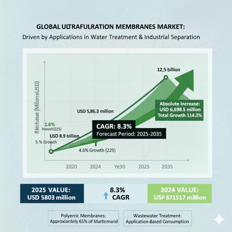 The global ultrafiltration membranes market is poised for robust expansion through 2035, fueled by escalating demand for clean water, stringent wastewater regulations, and rising adoption in pharmaceuticals and food processing. According to Future Market Insights (FMI), the market is valued at USD 5,865.3 million in 2025 and is projected to surge to USD 12,563.8 million by 2035, registering a compound annual growth rate (CAGR) of 8.3%.The FMI report, "Ultrafiltration Membranes Market Size & Forecast 2025-2035," reveals the market will add nearly USD 6.7 billion in value over the decade, driven by innovations in fouling-resistant materials, decentralized systems, and digital monitoring integration across municipal and industrial applications.