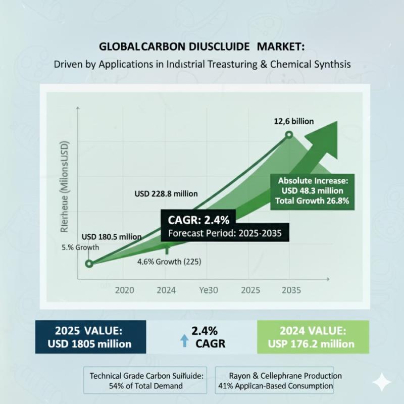 The global carbon disulfide market is poised for moderate yet resilient growth through 2035, underpinned by enduring demand in textiles, mining, and agrochemicals despite tightening environmental regulations. According to Future Market Insights (FMI), the market stands at USD 180.5 million in 2025 and is forecasted to climb to USD 228.8 million by 2035, achieving a compound annual growth rate (CAGR) of 2.4%.