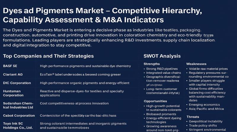 The Dyes and Pigments Market is entering a decisive phase as industries like textiles, packaging, construction, automotive, and printing drive innovation in coloration chemistry and eco-friendly formulations. As sustainability and performance-based differentiation reshape product portfolios, leading players are strategically enhancing R&D investments, supply chain localization, and digital integration to stay competitive. The market's evolution is no longer limited to cost optimizatsion-it now hinges on brand transparency, regulatory alignment, and advanced…