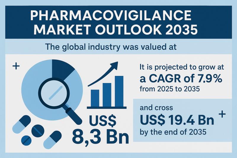 The global Pharmacovigilance Market is set for robust expansion over the next decade, with market value projected to rise from US$ 8.3 Bn in 2024 to US$ 19.4 Bn by 2035, expanding at a CAGR of 7.9% from 2025 to 2035, according to the latest market analysis.