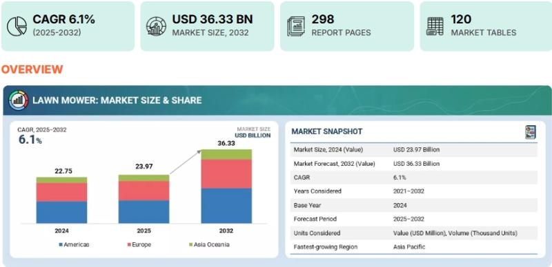 The global lawn mower market [https://www.marketsandmarkets.com/Market-Reports/robotic-lawn-mower-market-52805135.html] is projected to reach USD 36.33 billion by 2032, from USD 23.97 billion in 2025, at a CAGR of 6.1%.