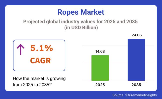 The European ropes market is poised for robust growth over the next decade, driven by technological innovations, increasing industrial applications, and expanding maritime and infrastructure activities. Valued at USD 14.68 billion in 2025, the market is projected to grow at a compound annual growth rate (CAGR) of 5.1% between 2025 and 2035, reaching an estimated USD 24.06 billion by 2035.