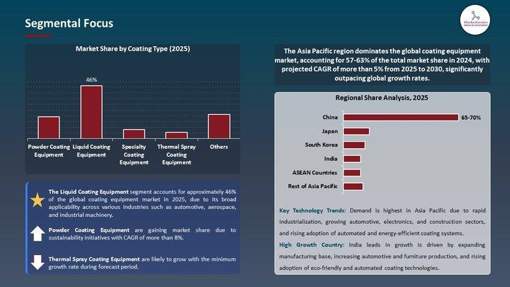 Asia Pacific dominated the global Coating Equipment Market in 2025, supported by large-scale production facilities across China, India, Japan, and South Korea. Rapid industrialization, expansion of EV production lines, and electronics manufacturing contribute to robust regional demand.