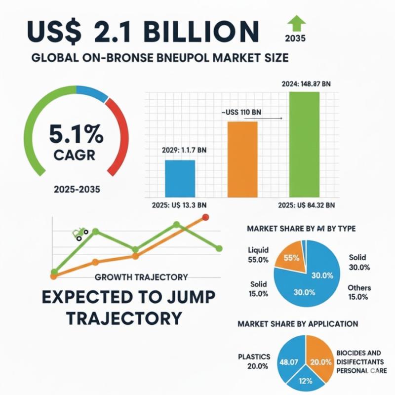 The global bronopol market is poised for steady expansion through 2035, fueled by escalating needs for microbial control in water systems, personal care, and industrial applications. According to Future Market Insights (FMI), the market is valued at USD 1.3 billion in 2025 and is projected to reach USD 2.1 billion by 2035, expanding at a compound annual growth rate (CAGR) of 5.1%.The FMI report, "Bronopol Market Size, Share, and Forecast 2025-2035," indicates global revenues will grow by USD 800 million over the decade, propelled by regulatory pressures for safer biocides, rising potable water demand, and broader adoption in oil & gas and coatings sectors.