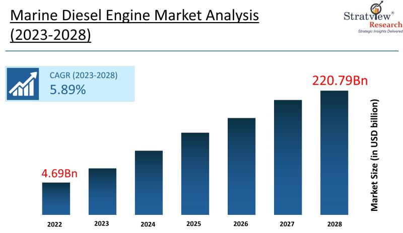 The Marine Diesel Engine Market is the global industry for diesel-powered propulsion systems that provide main propulsion and auxiliary power for marine vessels. The market is projected to grow from **US$ 4.69 billion in 2022 to US$ 220.79 billion by 2028 at a CAGR of 5.89% during 2023-2028. This growth is driven principally by expansion in the shipping industry, as marine diesel engines remain the most widely used propulsion source…