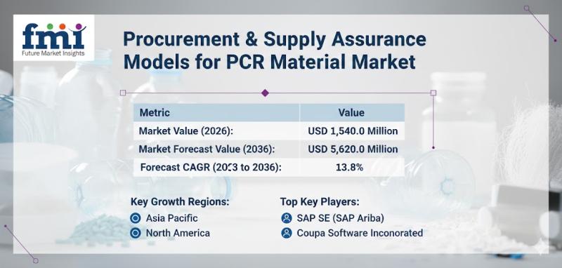 The global procurement & supply assurance models for PCR material market is projected to expand significantly over the next decade, increasing from USD 1,540.0 million in 2026 to USD 5,620.0 million by 2036, registering a CAGR of 13.8%, according to the latest analysis by Future Market Insights (FMI). Growth is being driven by increasing complexity in recycled material sourcing, rising procurement risk exposure, and the growing need for structured assurance…
