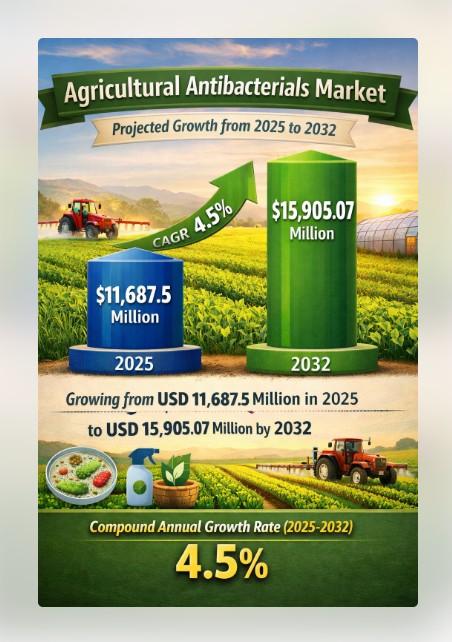 The Agricultural Antibacterials Market is positioned for steady expansion as modern farming systems increasingly prioritize crop protection, disease management, and yield stability. The market is projected to grow from USD 11,687.5 million in 2025 to an estimated USD 15,905.07 million by 2032, registering a compound annual growth rate (CAGR) of 4.5% during the forecast period. This growth trajectory reflects the persistent need to combat bacterial plant diseases, the expansion of…