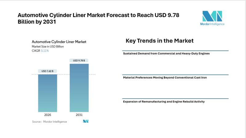 According to Mordor Intelligence, the automotive cylinder liner market size stood at USD 7.62 billion in 2026 and is projected to reach USD 9.78 billion by 2031. This steady expansion reflects the continued relevance of engine durability, thermal management, and serviceability across regions where combustion-based powertrains remain central to mobility and industrial transport.