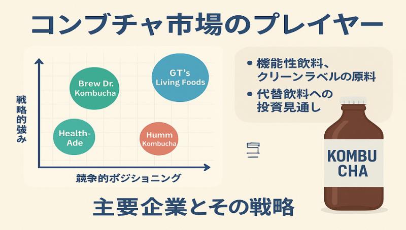 消費者が機能性飲料、クリーンラベルの原料、そしてプロバイオティクスを豊富に含む製品へと移行するにつれ、コンブチャ市場は新たな変革の波を経験しています。健康意識の高まりと代替飲料への嗜好の高まりを背景に、コンブチャブランドはプレミアムフレーバー、低糖配合、そして革新的な醸造技術によってポートフォリオを進化させています。このカテゴリーは、ニッチな自然食品店から、主流の小売店、カフェ、そしてeコマースチャネルへと拡大しています。市場の競争が激化するにつれ、フレーバーの革新、持続可能な調達、そしてマーケティングの俊敏性といった戦略的な差別化がリーダーシップを決定づけるようになっています。この記事では、コンブチャ市場に影響を与える主要企業を分析し、その競争優位性を評価するとともに、急成長を遂げる機能性飲料セグメントの将来展望を形作る新たな投資テーマを浮き彫りにします。