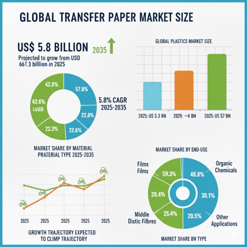 The global transfer paper market is poised for robust expansion through 2035, fueled by surging demand for personalized apparel, advancements in digital printing, and the rise of sustainable textile innovations. According to Future Market Insights (FMI), the market is valued at USD 3.3 billion in 2025 and is projected to reach USD 5.8 billion by 2035, expanding at a compound annual growth rate (CAGR) of 5.8%.