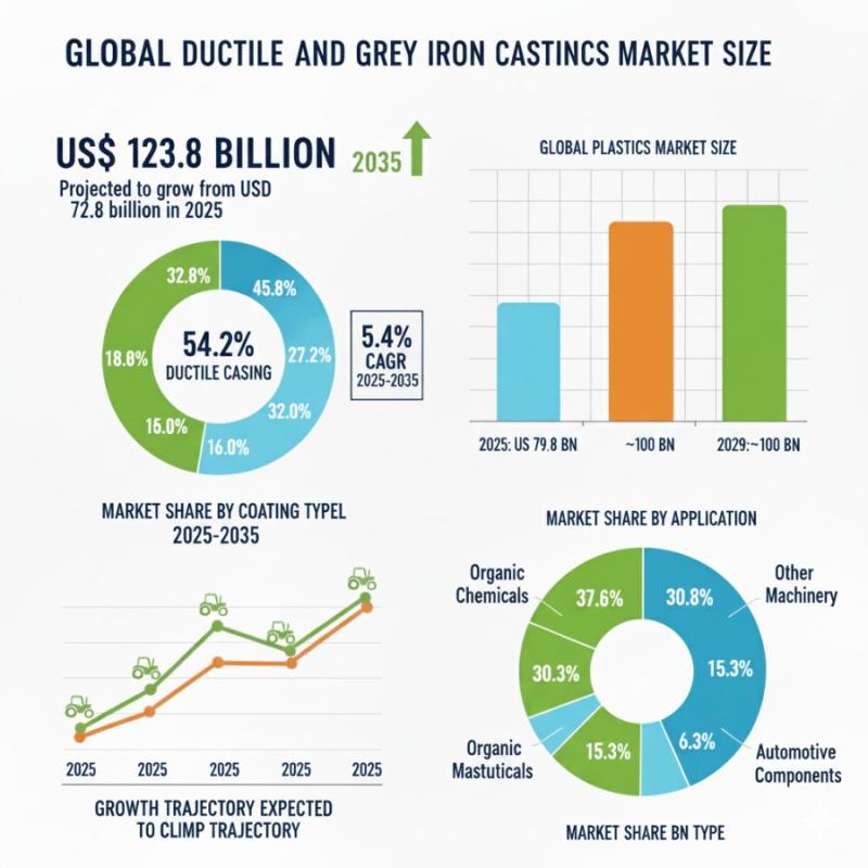 The global ductile and grey iron casting products market is poised for robust expansion through 2035, fueled by automotive innovation, infrastructure megaprojects, and advancements in lightweight, high-strength materials. According to Future Market Insights (FMI), the market is valued at USD 72.8 billion in 2025 and is projected to reach USD 123.8 billion by 2035, expanding at a compound annual growth rate (CAGR) of 5.4%.The FMI report, "Ductile and Grey Iron Casting Products Market Size, Share, and Forecast 2025-2035," indicates global revenues will surge by nearly USD 51 billion over the decade, propelled by escalating demand for durable components in automotive, machinery, and renewable energy sectors amid urbanization and industrial digitization.