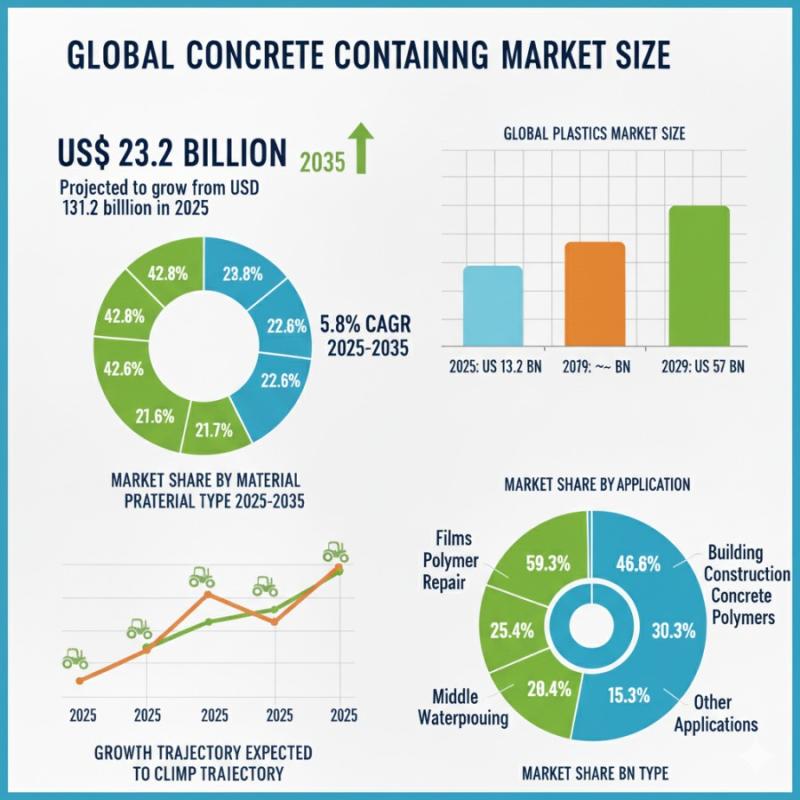 The global concrete containing polymer market is poised for robust expansion through 2035, fueled by rising demand for resilient, eco-friendly materials in construction, repair, and industrial applications. According to Future Market Insights (FMI), the market stands at USD 13.2 billion in 2025 and is forecasted to surge to USD 23.2 billion by 2035, achieving a compound annual growth rate (CAGR) of 5.8%.