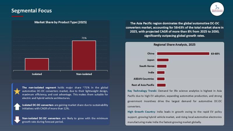 A few datapoints matter because they change procurement decisions. The non-isolated segment accounts for roughly 71% of the Automotive DC-DC Converters Market in 2025 - favored for weight, efficiency, and cost advantages in EV architectures where galvanic isolation is not always mandatory.