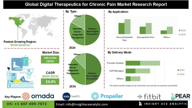 InsightAce Analytic Pvt. Ltd. announces the release of a market assessment report on the "Global Digital Therapeutics for Chronic Pain Market Size, Share & Trends Analysis Report By Type (Software-Based Digital Therapeutics, Mobile Application Therapeutics, and Wearable Device-Integrated Therapeutics), Delivery Mode (Self-Managed and Provider-Guided), Application (Neuropathic Pain, Musculoskeletal Pain, Fibromyalgia, and Post-Surgical Pain), End-use (Patients and Healthcare Providers),-Market Outlook And Industry Analysis 2034"