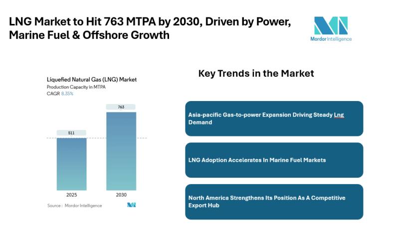According to Mordor intelligence report, global LNG production capacity is projected to grow from 511 MTPA in 2025 to 763 MTPA by 2030, supported by increased liquefaction activity in the Middle East, North America, and emerging African exporters. The market is expected to maintain a CAGR of 8.35% during the forecast period.