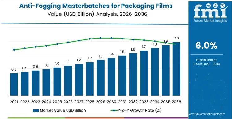 The global anti-fogging masterbatches for packaging films market is forecast to expand from USD 1.1 billion in 2026 to USD 2.0 billion by 2036, registering a steady compound annual growth rate (CAGR) of 6.00% over the forecast period. Market growth is being driven by rising demand for transparent, high-performance food packaging, alongside increasing emphasis on shelf-life protection, product visibility, and supply-chain reliability.