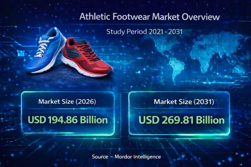 The global athletic footwear market size is projected to grow from USD 194.86 billion in 2026 to USD 269.81 billion by 2031, registering a CAGR of 6.73% during the forecast period. The sustained athletic footwear market growth reflects rising demand for performance-oriented shoes, lifestyle integration, and expanding participation in sports and fitness activities worldwide.