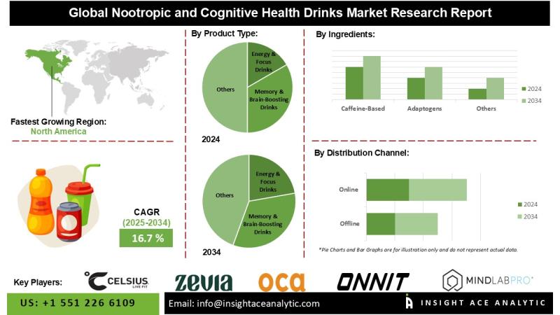 InsightAce Analytic Pvt. Ltd. announces the release of a market assessment report on the "Nootropic and Cognitive Health Drinks Market"- By Product Type (Energy & Focus Drinks, Memory & Brain-Boosting Drinks, Relaxation & Stress-Relief Drinks, Hydration & Adaptogen-Based Drinks), By Ingredients (Caffeine-Based, Adaptogens ,Amino Acids & Neurotransmitters, Nootropic Herbs, Vitamins & Minerals, Synthetic Nootropics), By Distribution Channel (Online & Offline), and Global Forecasts, 2024-2034 And Segment Revenue and Forecast To…