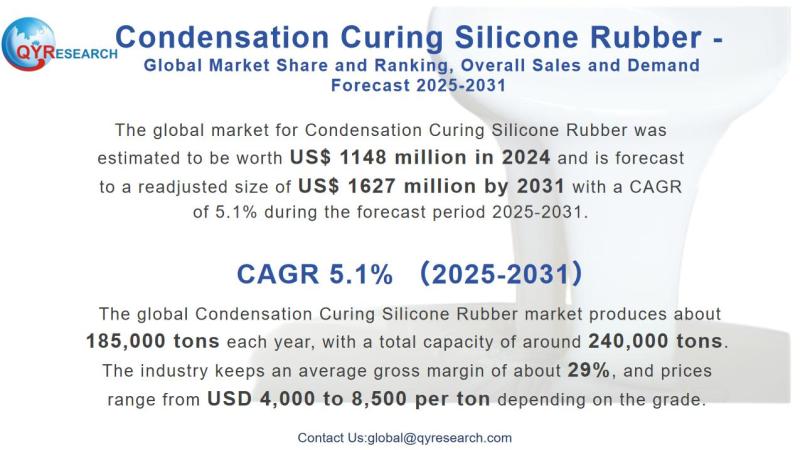 The global market for Condensation Curing Silicone Rubber was estimated to be worth US$ 1148 million in 2024 and is forecast to a readjusted size of US$ 1627 million by 2031 with a CAGR of 5.1% during the forecast period 2025-2031.