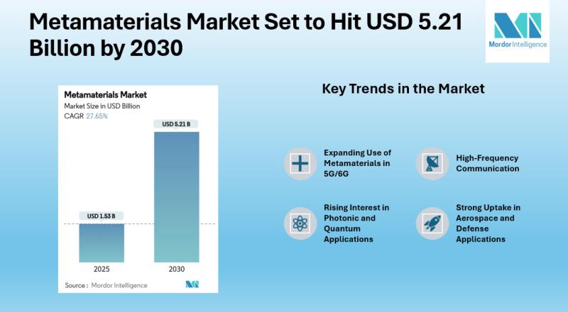 Growing Momentum in the Metamaterials IndustryAccording to Mordor intelligence market estimates, the metamaterials market size is expected to grow from USD 1.53 billion in 2025 to USD 5.21 billion by 2030, reflecting a strong 27.65% CAGR during the forecast period.