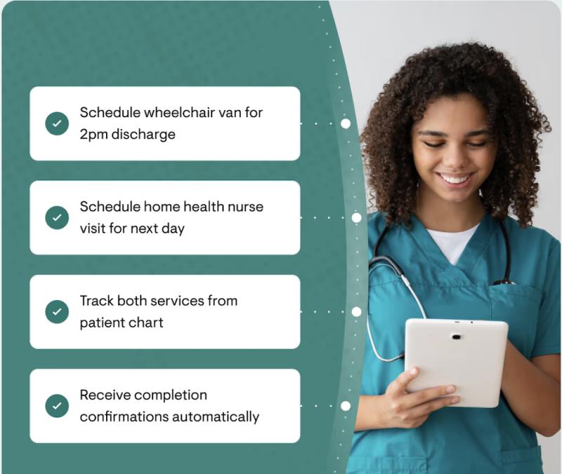 • Care teams remain inside the EHR-they don't switch to separate systems-to initiate logistics workflows, view real-time updates (such as vehicle arrival times and GPS tracking), and send messages to vendors and care coordinators.
